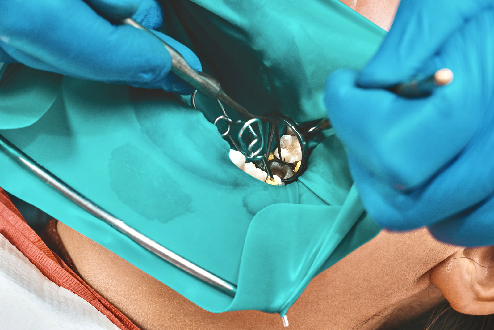 また、治療中に細菌が侵入することがないように、自費のセラミック治療では、「ラバーダム」という器具を使用しています。ゴム状のシートで患部を除いてお口を多うことで、最近の侵入をシャットアウトします。