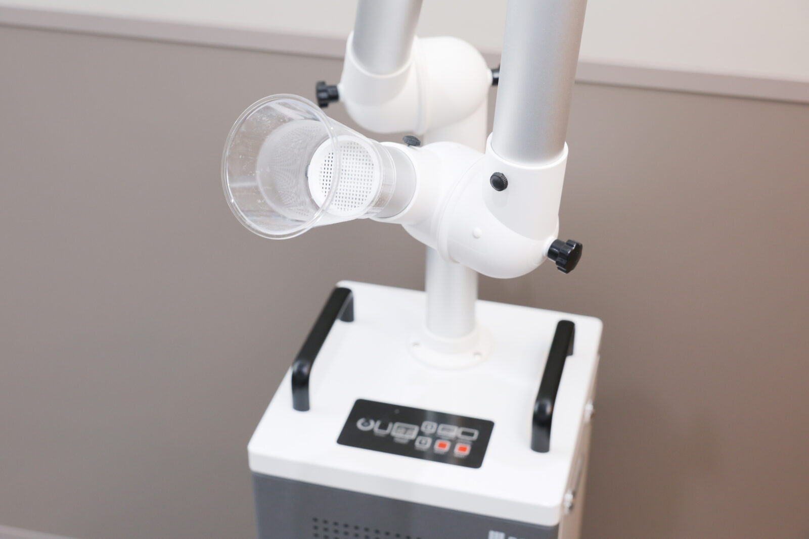 口腔外バキュームは、空気中の細かい粉塵を強力な吸引力で吸い込む機器です。歯科医院では、歯を削ったり、入れ歯や銀歯を調整するとき、歯の削りかす、金属片、血液、細菌など目に見えない細かい粉塵が発生します。当院では、こうした粉塵が広がってしまわないように、診療室に口腔外バキュームを設置しています。快適でクリーンな診療室をつくるためには欠かせません。
